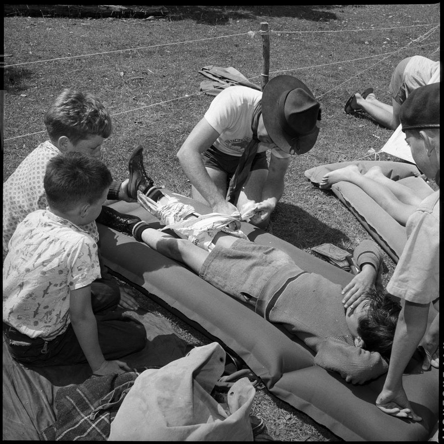 This image was not published in The Manawatu Evening Standard, taken on 25 January, 1964. [Scouts looking on as their leader shows how to splint a broken leg.] See also: 2017N_2017-20_018375, 2017N_2017-20_018365, 2017N_2017-20_018371, 2017N_2017-20_018373, 2017N_2017-20_018366, 2017N_2017-20_018369, 2017N_2017-20_018370, 2017N_2017-20_018372, 2017N_2017-20_018374, 2017N_2017-20_018376