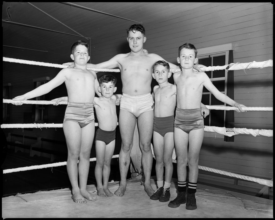 This image was not published in The Manawatu Evening Standard, taken on 1 October, 1959. "Manawatu wrestling titleholders from the Kiwi Sports Club with their trainer, P. Collins." Another photo associated with this article was published on the 1 October 1959.
