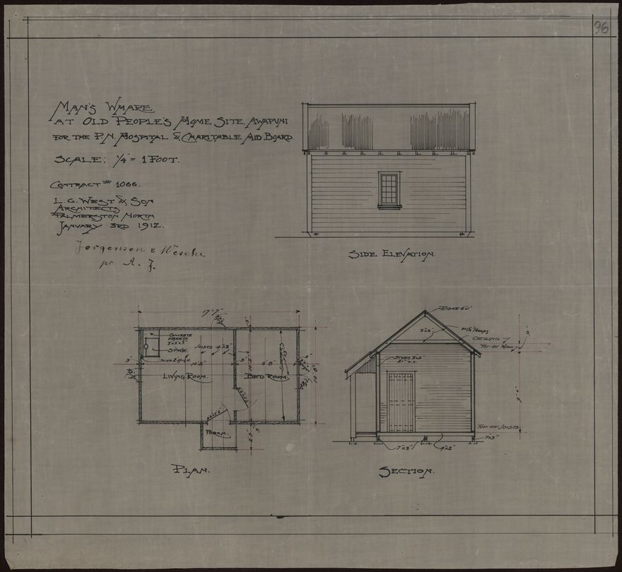 This plan of a two room dwelling, comprising of a livingroom and bedroom, was designed by L. G. West for the Palmerston North Hospital and Charitable Aid Board. Planning for the Awapuni Old People's Home commenced in 1911 and the facility was opened in April 1915 by the Minister of Public Health, the Honorable R. Heaton Rhodes. Initially, it provided accommodation for eight women and 24 men. The Danish-born architect Ludolph Georg West (1846-1919) established an architectural practice in Palmerston North in about 1880. In 1912 he formed a partnership with is son, Ernest Vilhem West, who continued the business after his father's death.