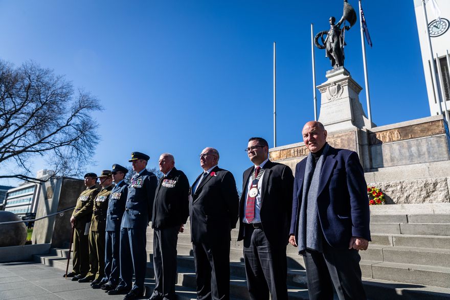 From left: Brigade Command Sergeant Major, WO1 Raymond Kareko; Lieutenant Colonel Ed Craw, RNZAC (Commanding Officer of the Queen Alexandra’s Mounted Rifles Regiment at Linton Camp); Command Warrant Officer Guy Lipsham; Base Commander Ohakea, Group Captain Shaun Sexton, RNZAF; Palmerston North Returned and Services Association Brigadier (Retired) Evan Torrance, who is PNRSA Welfare Trust Chair and Manawatū Officer’s Club Patron; Lieutenant Colonel (Retired) Joe Hollander, RNZE (PNRSA Vice-President); Tangi Utikere (Deputy Mayor); Wiremu Te Awe Awe (Rāngitane).