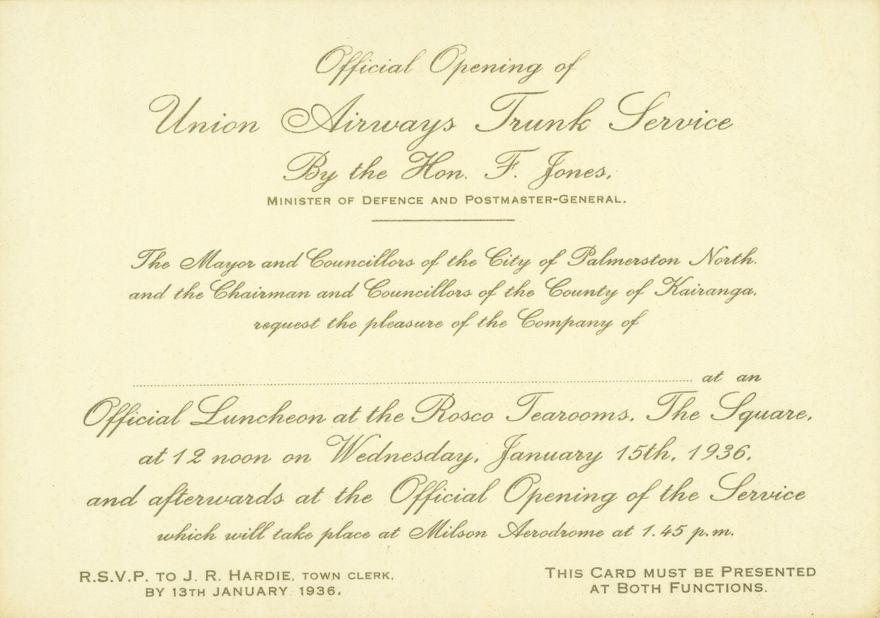 Union Airways of NZ Ltd began services between Palmerston North and Dunedin on 5 January 1936. The official opening, on 15 January 1936, was marked by a luncheon and a ceremony at the Milson Airport.