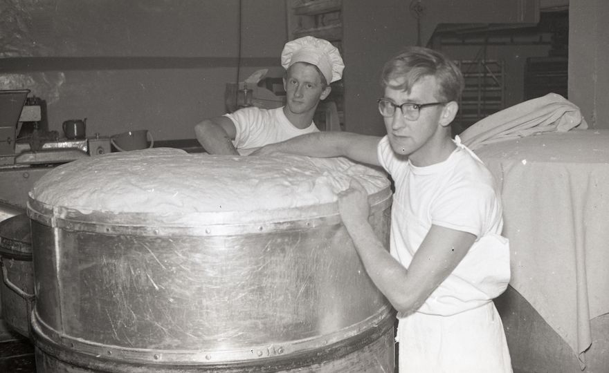 Caption: "The Manufacture of Bread - An Essential Food. The bread we eat each day is one of the many things we take for granted and Photorama on these three pages shows the process needed in the manufacture of bread. Bridewell Bakery Palmerston North and Levin is one of five bakers in this area who bake every night five nights a week producing our daily bread. This firm with a staff of 17 in Palmerston North and 11 in Levin turn out well over two million loafs of bread a year."