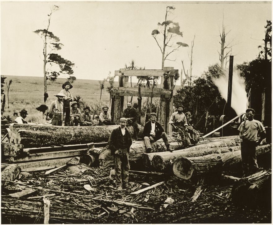 Workmen stop for a break from sawing up logs into timber. It is believed to be in the Feilding/Halcombe area.