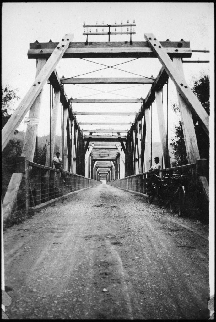 Two boys pose with their bicycles on the second Ashhurst bridge, built in 1909. The original bridge was lost due to flooding in 1895, but was not replaced until 1909. In the interim, a ferry was used to take passengers and transport across the Manawatu River.