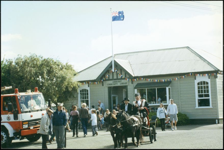 On the occasion of the Ashhurst (former) Post Office building's centenary. The building is now used at the town library. In this photograph the Mayor of Palmerston North, Paul Rieger, drives off in a horse and trap.