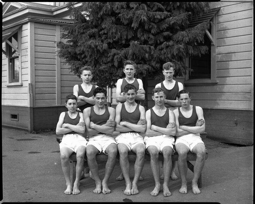 A group of eight male students pose in their sports uniforms. The Palmerston North Technical High School was opened in September 1909 on what is now Princess Street, Palmerston North. In 1956 the school moved to the Rangitikei Street site and became known as Queen Elizabeth Technical College. The original building and site is now used by the Universal College of Learning [UCOL]. This negative comes from the Elmar Collection - a large series of semi-identified and unidentified images from the 1930s-1970s.