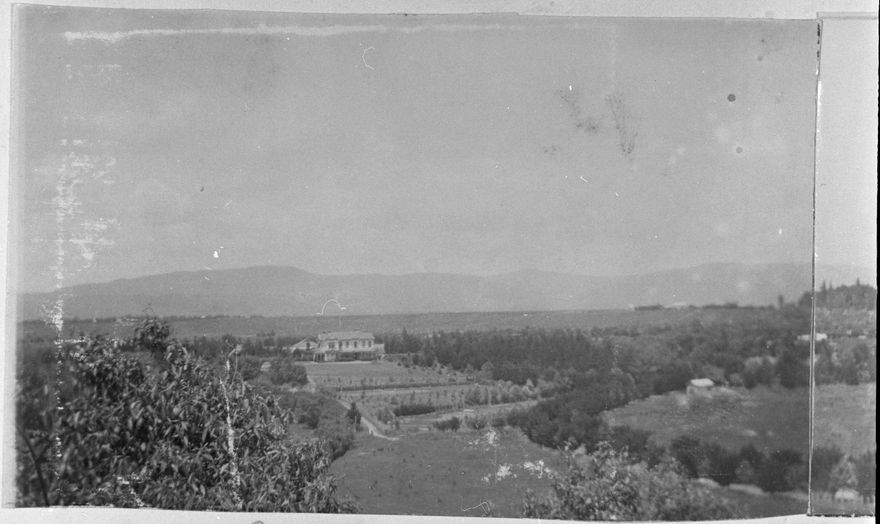 This photograph was taken from the bluff on the north bank of the Tiritea Stream, looking across to Richard Slingsby Abraham’s two-storied residence “Tiritea', constructed in 1903. In the 1920s the McHardy Estate, as it later became, was acquired for the site of Massey Agricultural College. In 1929 the house was cut in two and both parts moved further back, to make way for the the 'Old Main Building'. One half then became the Registry and the other half the Principal's residence.