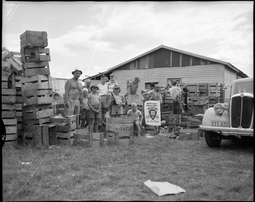 This image was taken for a story that ran in The Manawatu Evening Standard on 28th January, 1963. "Members of the Ashhurst Jaycee, with members of the scout movement, made light work of bottle collecting in Ashhurst on Saturday. The Jaycees ran the project for the scouts to raise funds for the proposed new scout den".