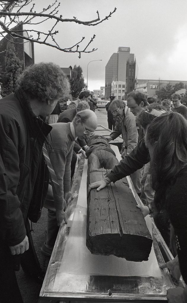 This image was taken (but not used) for a story that ran in The Manawatu Evening Standard on 4th August 1993. "The air was thick with emotion when four Rangitāne pouwhenua (carved stockade posts) were returned home yesterday after an absence of 60 years. Originally from Puketotara Pa, the pouwhenua were considered significant and important taonga for the Rangitāne people. They were the only large Rangitāne carvings still in New Zealand, and four of seven in existence. In 1933, Wiremu Kingi Te Awe Awe presented the carvings to the then Dominion Museum for safekeeping. There they were displayed in the Māori Hall for many years. Today, a delegation from the Museum of New Zealand, Te Papa Tongarewa, led by board chairman Sir Hamish Hay and Māori art and history director Cliff Whiting, handed over the carvings on a permanent loan basis to the Manawatu Museum. They will form a major component of the exhibitions in the new Manawatu Museum - Science Centre, opening in February next year. Mr. Whiting said the decision to return the carvings to their area of origin was part of the New Zealand Museum's policy of partnership with other museums. [Pictured] One of the four Rangitāne pouwhenua, returned to the Manawatu yesterday, is unveiled in preparation for transportation to a wing of the Museum's new premises."