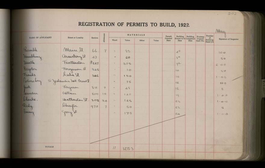Page from the third Register of Building Permits for Palmerston North Borough Council from April 1922 to March 1935.