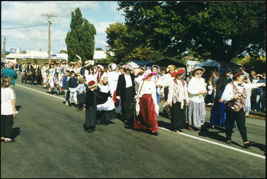 On the occasion of the Ashhurst (former) Post Office building's centenary. The building is now used at the town library. In this photograph people are marching down the street in the parade.
