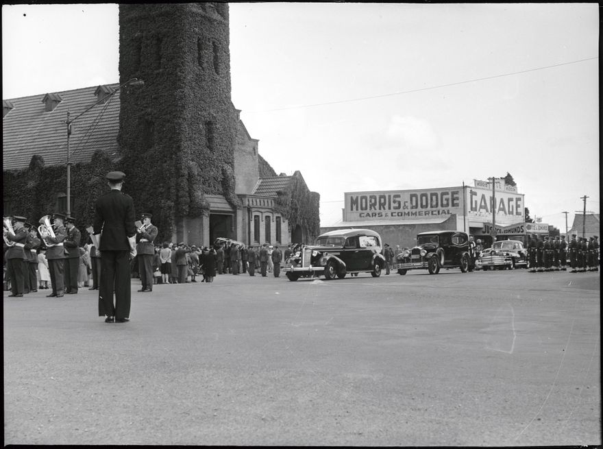 This photograph shows a funeral for the Air Force personnel lost on 25 November 1945 during a routine meteorological flight out of Ohakea. On March 19, 1949 the wreck of the RNZAF Ventura aeroplane with four crew members on-board was discovered; which had been missing since February 28, 1946. The crash location was three miles from Otaki in extremely hill country and the wreck was partially covered by scrub. The crew were: Flight-Lieutenant Walter Gordon Jacobs, the 27 year old Pilot; Flight-Lieutenant Sidney Howard Langton, the 24 year old navigator; Warrant-Officer Hedley Beaumont Newell, the 25 year old wireless-operator-air gunner; AC1 Anthony John Hayhurst, the 22 year old meteorologist. The men were given a combined military funeral at All Saints Church and buried at Kelvin Grove Cemetery in the Military Section. See A175/5 for further information.