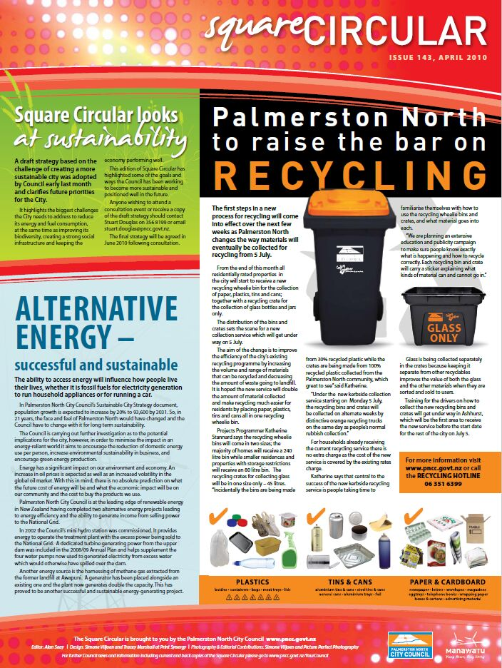 The Square Circular was Palmerston North City Council's monthly community publication, informing Palmerstonians of PNCC initiatives, activites, and events. This month's issue includes: Recycling; Sustainable City Strategy; Transportation; Ecosystems; Housing; Plaza; Permits; Artists; "Reel Earth"; Events; Website; Green Corridors.