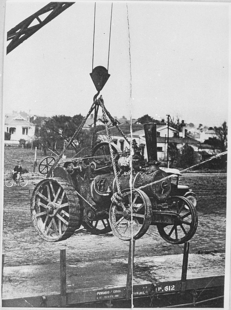 Fred Currie's tractor unloading a traction engine at the Terrace End Railway Station