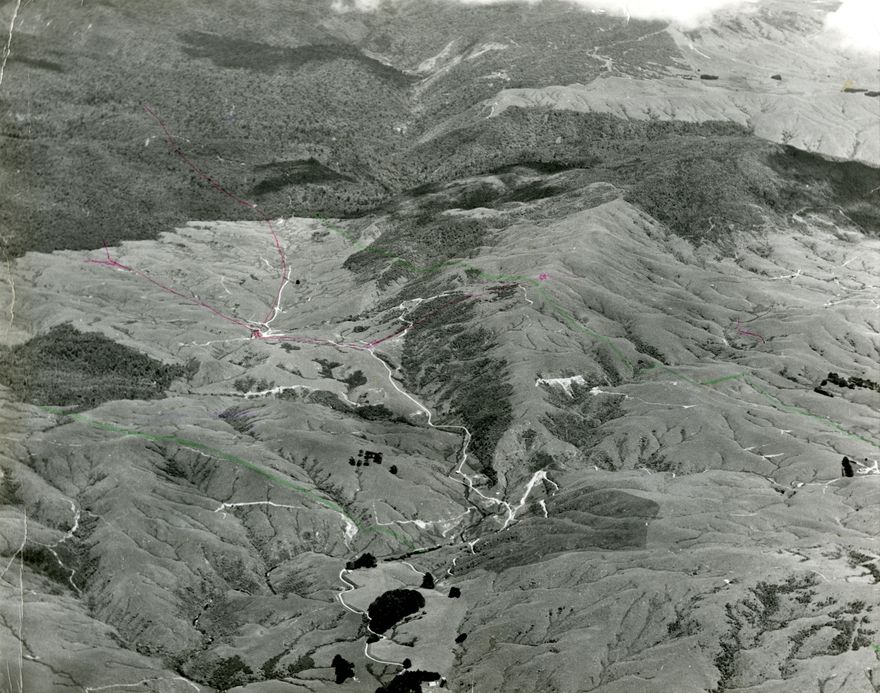 This photograph was taken when the this area of land (now Gordon Kear Forest) was bought from the Argyle family. It was a sheep farm before trees were planted. Note the Tokomaru Gorge in the = center back of the image leading to Mangahao, part of the Te Araroa Walkway (which runs the length of New Zealand track).