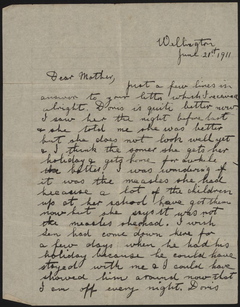 Pat (Percival) Argyle (1890-1915) was the son of Henry and Alice Argyle of Bunnythorpe. At the time of this letter he was working with the railways in Wellington. This letter is to his mother, mainly talking about other family members (including Doris his sister). Pat enlisted and served in World War One. He died at Chunuk Bair in 1915.