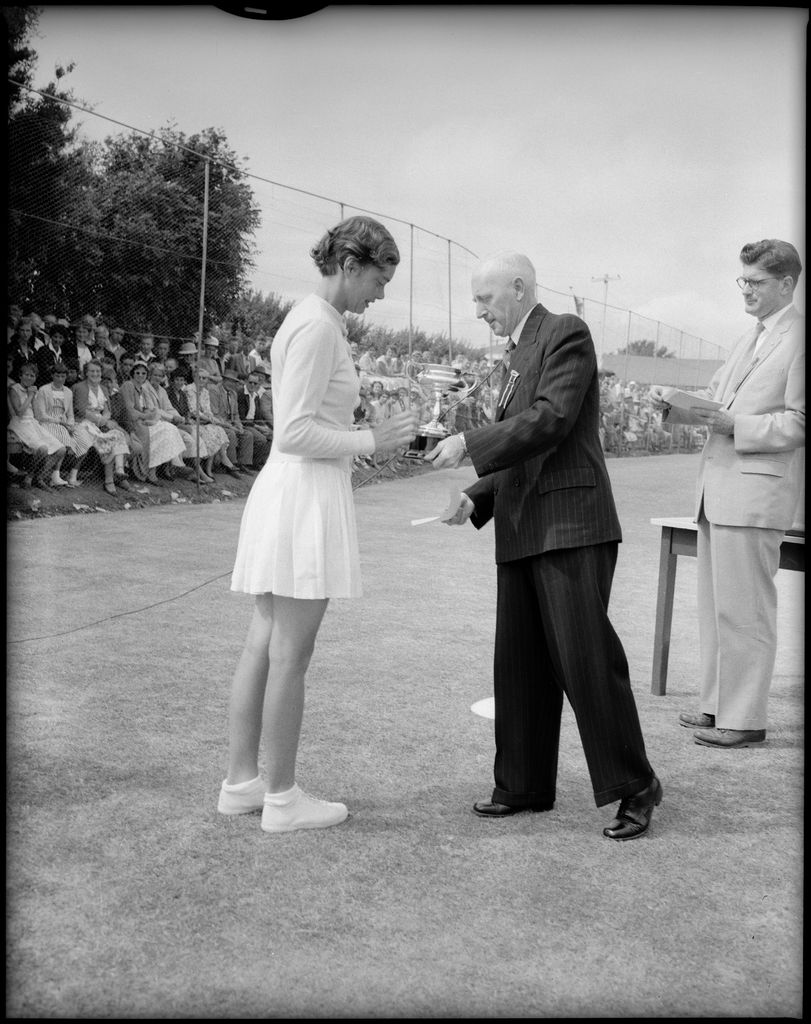 This image was taken for a story that ran in The Manawatu Evening Standard on 27 January 1958, page 11: Miss J. Glenie of Auckland presented with the cup for the under 19 years girls' singles. Miss Glenie beat a fellow Aucklander, Miss E. Bryant in the final.