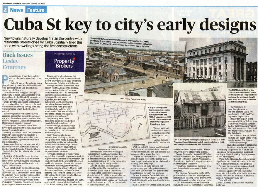 Local historians weekly "Back Issues" article in the Manawatū Standard. The story of Cuba Street and surrounding streets from Palmerston North's early days. The street was on the original Palmerston town plan. Its commercial heyday was arguably in the first half of the 20th century, when it was predicted that it could rival Te Marae o Hine/The Square in importance. However, this importance did not endure and Cuba Street is now mostly used as the main route leading to the Showgrounds.