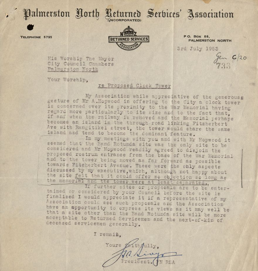 https://d28dhd8eubcyz4.cloudfront.net/iiif/2/curtis-production2-cache%2F1%2Fd%2F8%2F8f8c43-6729-45dd-81bd-447f87039cfb%2Fresize_master_f6c69d2123d64eafa67c618e693ca8d4.jpg/full/!880,1024/0/default.jpg?sig=3b5ac8392bbecf8f74c522856744fa07749c23ac&ver=1628684395Letter from the Palmerston North RSA, regarding concerns over the siting the Clock Tower in The Square