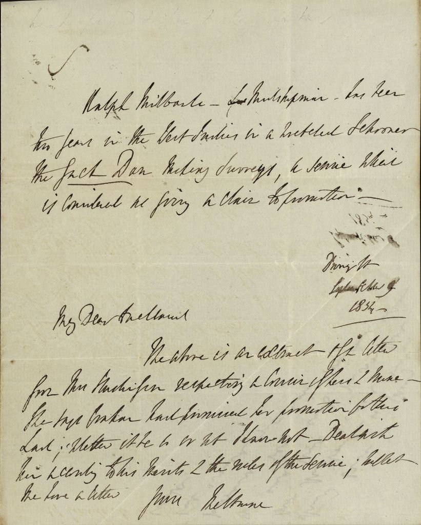 Letter in the hand of Lord Melbourne requesting information on 'Ralph Milbank - midshipman - has been two years in the West Indies in a … schooner, the Jack Daw, making surveys....'. Three pages, not all writing is legible. Further comments written in two other hands, including suggestion to 'ask Captain Beaufort' and that 'He [Milbank] is a mate on board the Jackdaw and passed 17 December 1831'. Lord Melbourne was the brother-in-law of Lord Palmerston, and Prime Minister of the United Kingdom for a time when Lord Palmerston was Secretary of State for Foreign Affairs. This record is part of a collection relating to Lord Palmerston (1784-1865), after whom Palmerston North was named. The donor of the Lord Palmerston collection, F C Holland of England (who was interested in philately and postal history) donated a number of items related to Lord Palmerton in the 1970s, after visiting Palmerston North. Cut from larger, unknown document.