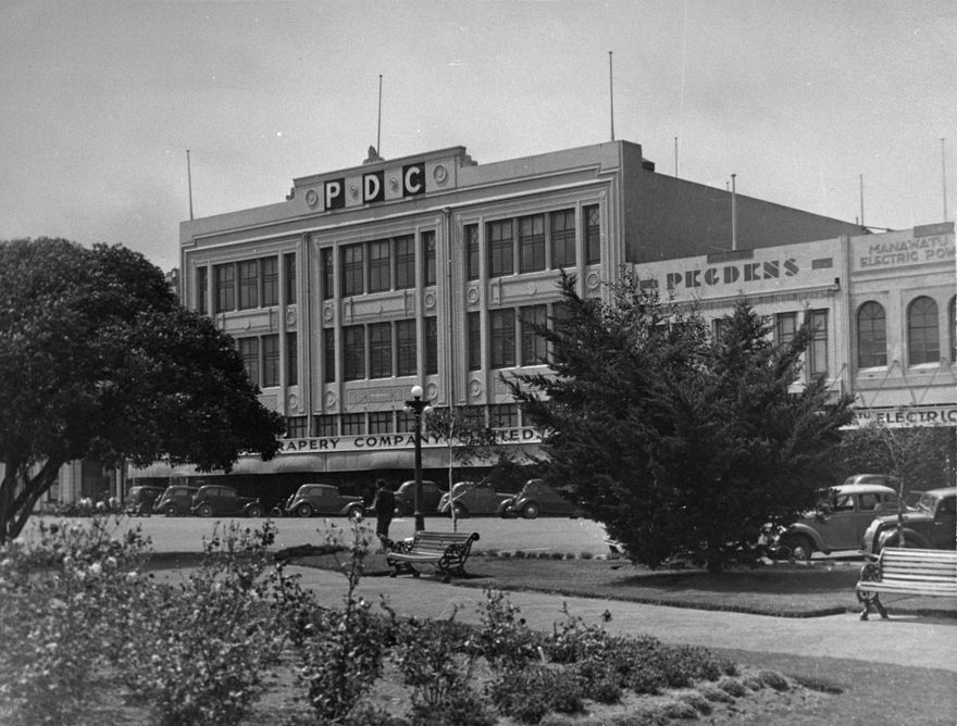 These premises of the Premier Drapery Company were built 1929-1930. The store was one of the foremost department stores in Palmerston North. In 1986 the PDC became part of the PDC Plaza. This was sold in 1988, and the PDC building demolished 1990.