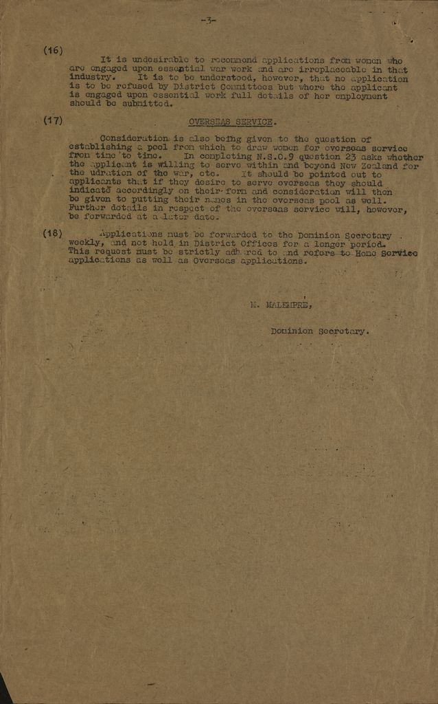 (18) Applications must be forwarded to the Dominion Secretary