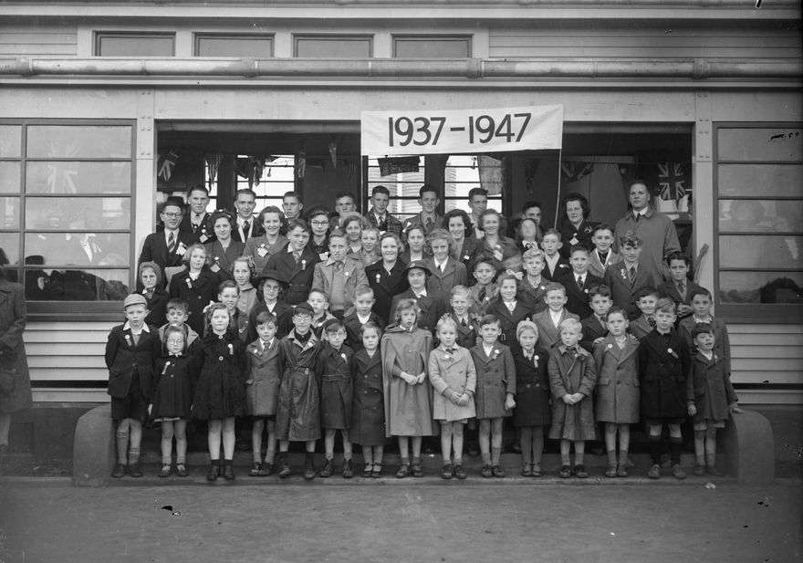 Pupils of Mangamaire Primary School from 1937-1947 pose under the banner on the steps of Mangimare School during the school reunion. The 50th jubilee celebration was an occasion to include the official opening of the new school, on 21 June 1947. The old school which had been vacated was given a new lease of life in 1949 when it was re-erected in the new school grounds to be used as an assembly hall. In the mid-1970s Mangamaire Country School combined with Marima, Hukanui, Hamua, Konini and Nikau schools.