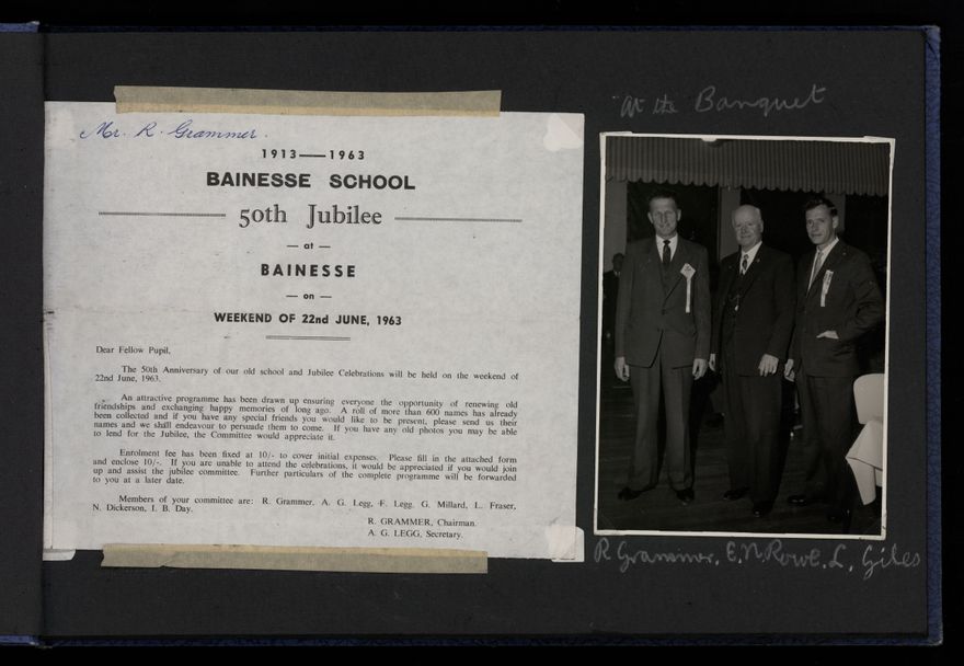 The Grammer family were early Ashhurst residents and the Grammer Family archive contains family information from 1868. Ron Grammer was the son of Tom Grammer and the family lived in Bainesse, close to Palmerston North. Private Ron Grammer served in World War Two. This album covers the Bainesse School 50th and 60th Jubilee celebrations.