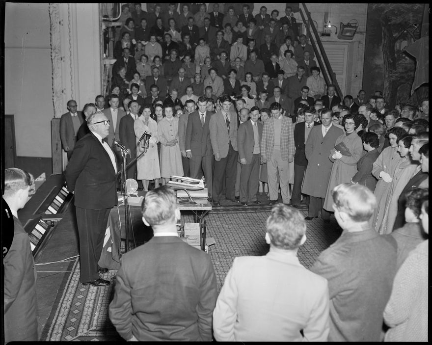 This image was taken for a story that ran in The Manawatu Evening Standard on 23 August 1960 "There was no lack of competitors to take part in the Selwyn Toogood show held in the Opera House last night, but a few short questions sent all but four back to their seats. The photograph shows some of the audience who tried their luck in the show."