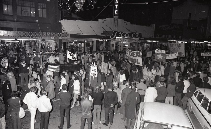 The March was organised by the Palmerston North Anti-war Mobilisation Committee, including R. Lyall, Massey University Student Association President Gary Emms, and Unionist Alan Millar. The Nash Street Jug Band lead the singing and Hana Burke sang ‘a Maori song of parting’. Poetry was read by Mr. Lyall and Des Woods. The Reverend Loyal Gibson of the Trinity Methodist Church lead prayers after Churches across the city rang their bells in solidarity.