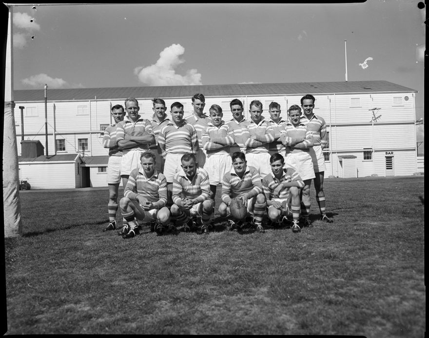 This image was taken for a story that ran in The Manawatu Evening Standard on 17 September, 1959. "The Manawatu Junior Rugby team which played Wellington Juniors in the curtain-raiser to Saturday's representative game between Manawatu and the touring Southland team. Back row, A. Reed, D. Knight, M. Frazer, M. Mitchell, G. Sisson, N. Armstrong; second row, K. Hughes, J. Harvey, J. Steele, K. McLeod, R. Johanson; in front, R. Gemmell, C. Clements, B. Monk (captain) and J. Scott."