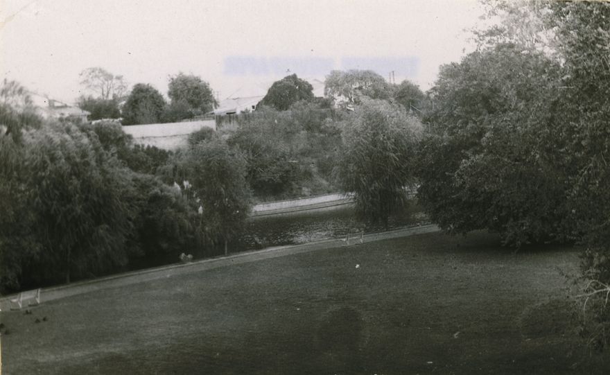 This photographs gives a view of Memorial Park, located in the suburb of Terrace End, Palmerston North. Shown here is a view of a walking path and seating adjacent to the lake. This park was formerly the site of an old metal pit at Terrace End. It was purchased by the City Council in 1939 and developed into a recreational and sporting area. It was named Memorial Park after the placing of a memorial to honour those killed in World War II.