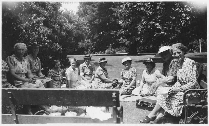 Members of a branch of the New Zealand Federation of Women's Institutes having a picnic in a gardens (perhaps in the Esplanade).