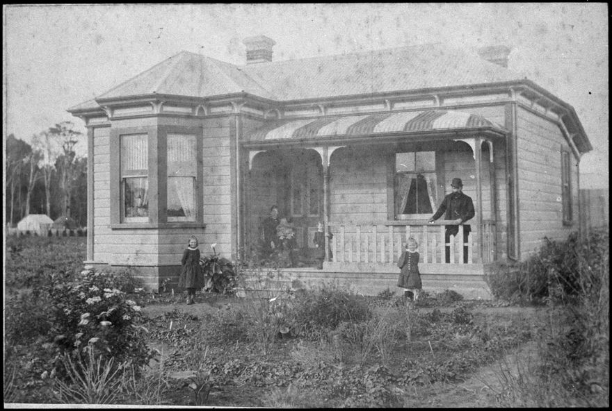 Niels and Ragnhild Hansen's newly built house at Whakarongo, situated nearly opposite James Line with the bush line beyond. Niels, an immigrant from Denmark, met and married Ragnihild Gudmudsen in Palmerston North in 1884. They moved to this house from a cottage on the same section, in the Scandinavian block, in 1893. The house was occupied by Sid Leader and his family in 1993. From left: Ingebord; Ragnhild holding baby Ragnhild, Marie, Lily and Niels.