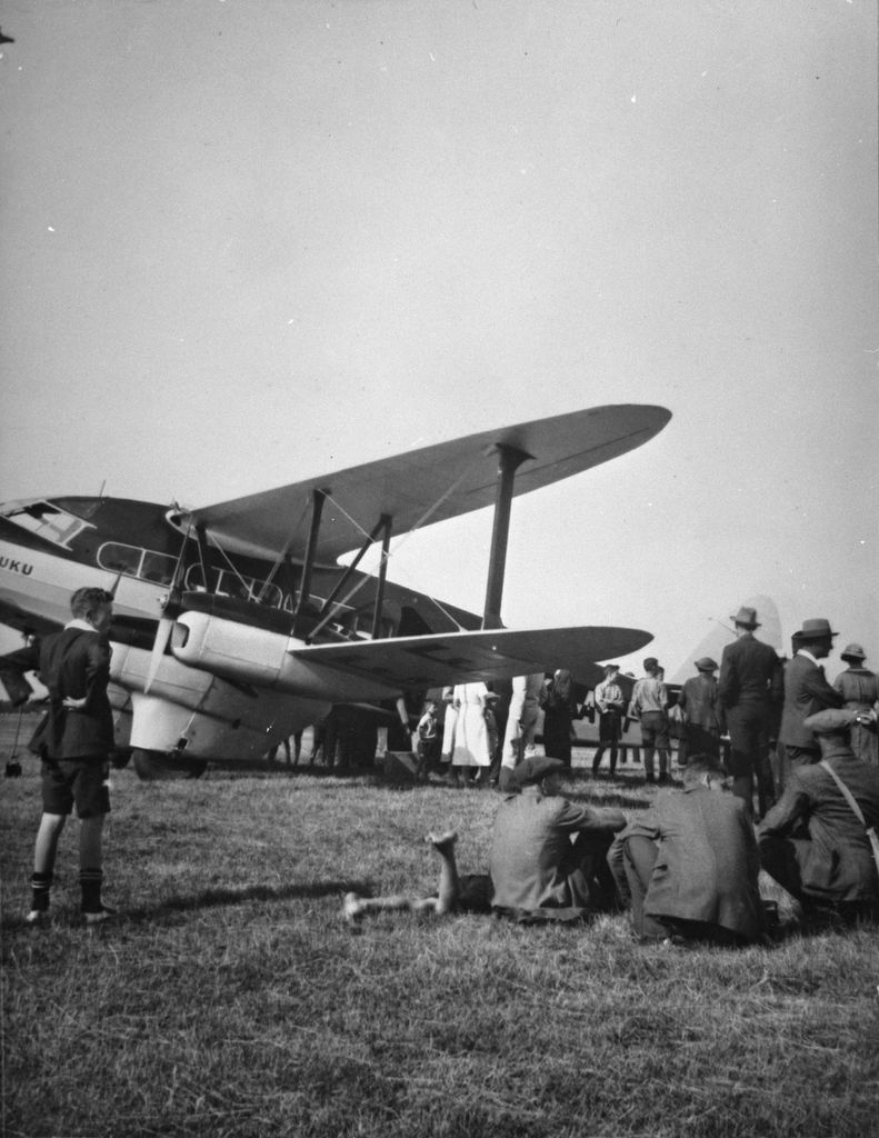 The aircraft, D.H. 86 Express airline ZK–AE, taken at the inauguration of the first commercial service from Palmerston North, by Union Airways of New Zealand Limited.