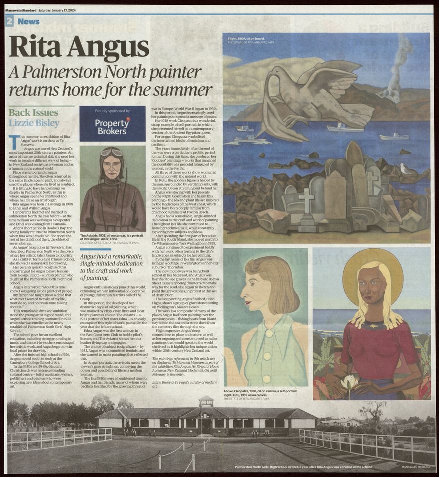 Weekly "Back Issues" article in the Manawatū Standard. The life story and work of artist Rita Angus (1908-1970). Born in Hastings, Rita Angus spent her childhood in Palmerston North, attending Terrace End School and Palmerston North Girls' High School, before moving to study at Canterbury College School of Art. Angus is one of New Zealand's most important 20th century painters. Some of her work is on display at an exhibition at Te Manawa Museum, January and February 2024.