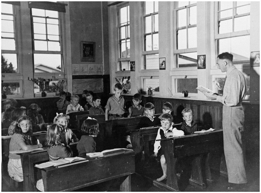 A photographic series prepared by the Prime Minister’s Department in 1947 to attract British migrants. The Evans family of 5 Mansford Place, Palmerston North were selected to show the living conditions of a typical New Zealand family. Most children from the Savage Crescent state housing area, developed between 1937 and 1945, attended West End School at the western end of the suburb. The school opened in 1913 and was the second public school to be built in Palmerston North after College Street School in 1893. The teacher is Mr. I A Charles.