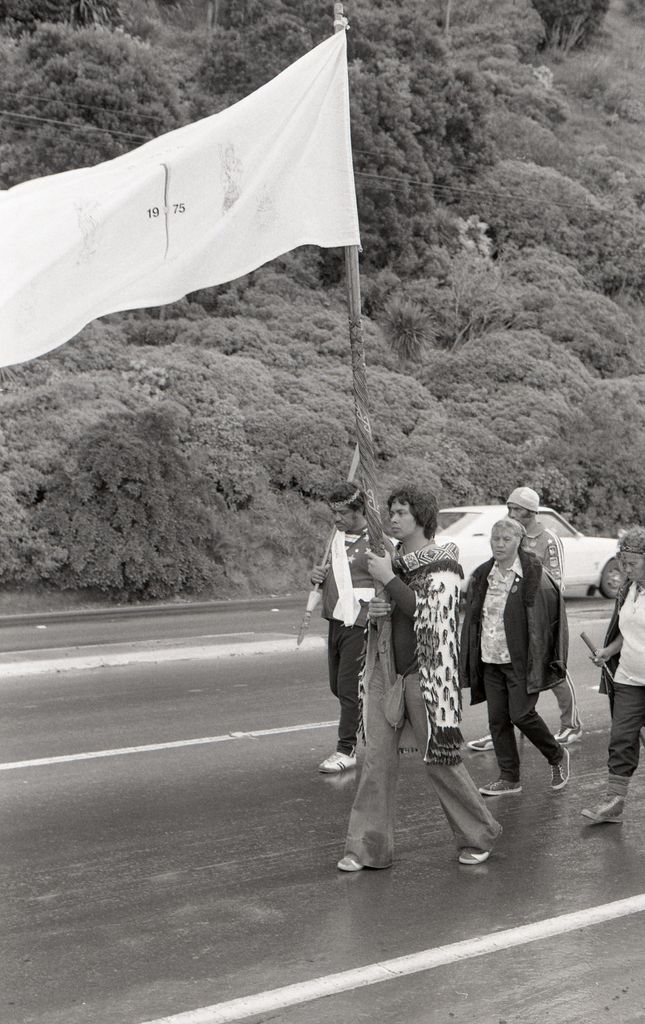 Starting from Porirua at 7a.m. the long column, led by its flag-bearer wearing a Maori cloak, turned into the straight stretch toward Johnsonville a few minutes before 9a.m.