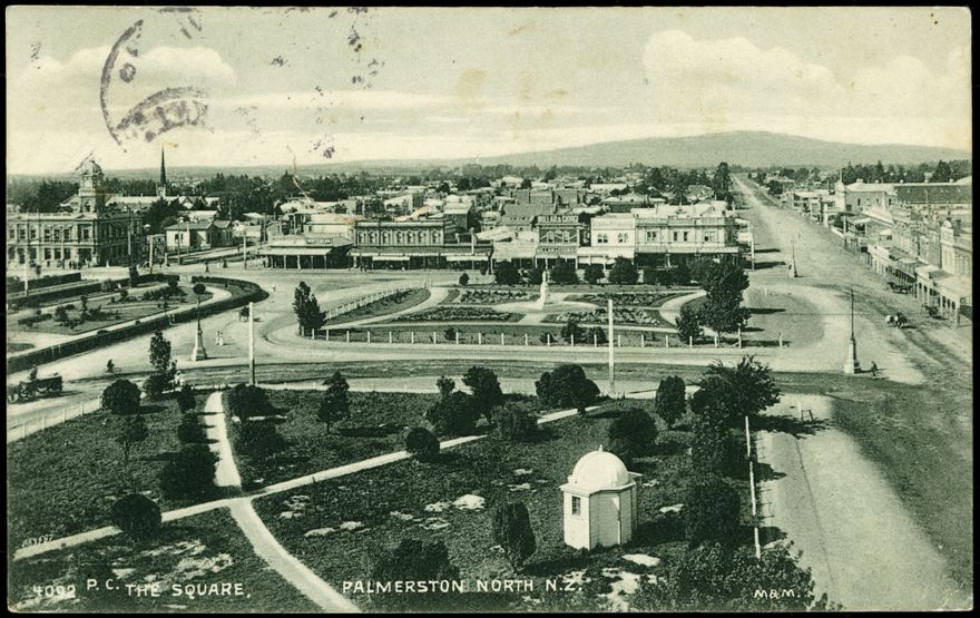 This postcard is looks across The Square from the corner of Church Street West to Main Street East. Note that the image was made before The Lakelet had been constructed. It would be dug where the path crosses in front of the Observatory. This domed structure was built in 1906 and demolished in 1938 after vandalism and light pollution from the growing city diminished its use.