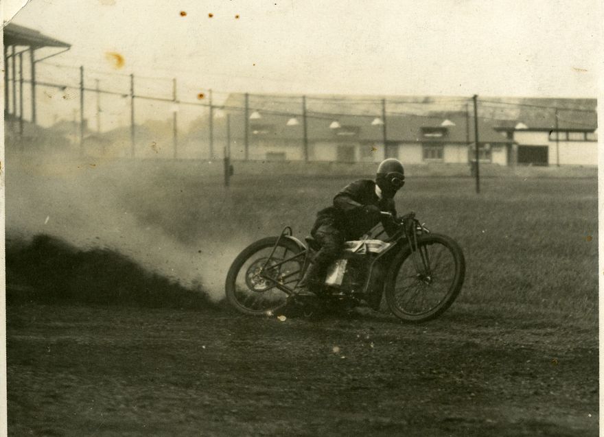 Robert "Bob" Patton, also known as "The Flying Farmer", at the Palmerston North Showgrounds, possibly driving a Douglas motorcycle. The photo is facing the Pascal Street end of the Showgrounds.