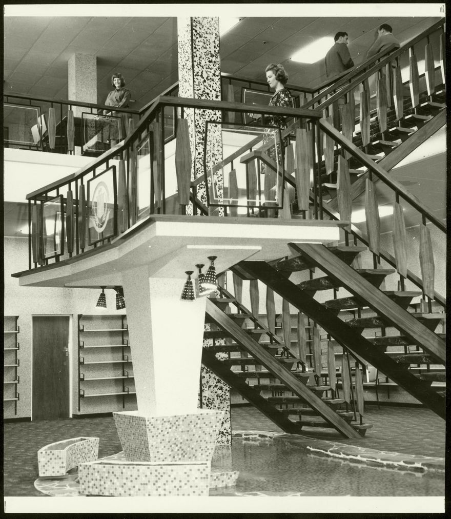A publicity image used in the souvenir programme for the offical opening of the public library in 1965. The reverse reads: "A view from the ground floor showing ornamental pool and internal stair to first floor."