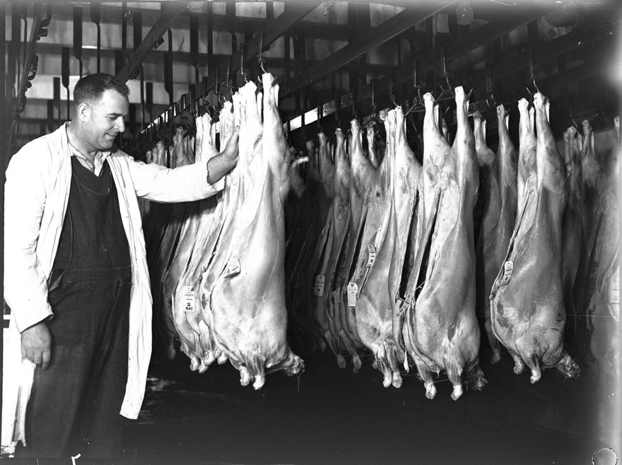 A workman inspects carcasses for export. Each carcass has a label recording the factory name, meat grade and identifying numbers. The Longburn Slaughtering and Freezing Company Ltd was established as a farmer's co-operative in 1890. Sited at Longburn, just south of Palmerston North, it later became known as the Longburn Freezing Works. It closed in 1986.