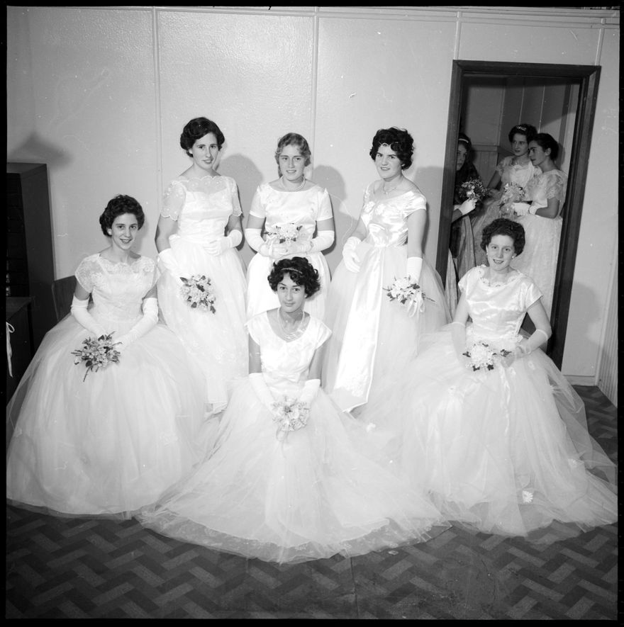 This image was taken for a story that ran in The Manawatu Evening Standard on 24 June 1961 "Sixteen debutantes made their curtsy to the Rt. Rev. Monsignor A.J. McRae last evening at the 15th annual Charity Ball in the Ballroom Astoria. Besides giving an opportunity for Roman Catholic Church girls to make their debut into society, this function is a means of raising funds for Catholic charities. Pictured are (from the left): Misses Ann Imrie, Maree Cook, Janette Thompson; front row, Misses Anne Toohey, Beverley Te Hiwa and Valerie Southee."