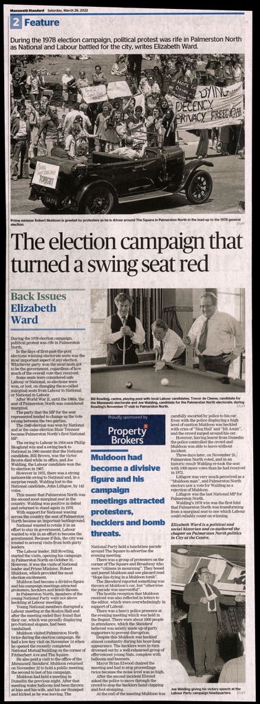 Local historians weekly "Back Issues" article in the Manawatū Standard. Since World War 2, Palmerston North was considered a swing seat, with National or Labour candidates winning elections. In 1978 it was the country's second most marginal seat and the two parties battled for the city. Party leaders held several local contentious meetings, with protest action directed mainly at National leader Robert Muldoon. The seat was won by Labour's Joe Walding and has since been held by the Labour Party. (2024).