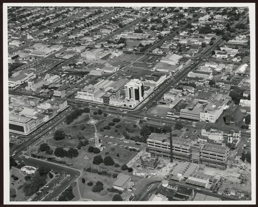 Aerial photograph of The Square in Palmerston North showing the construction of the Civic Administration Building.