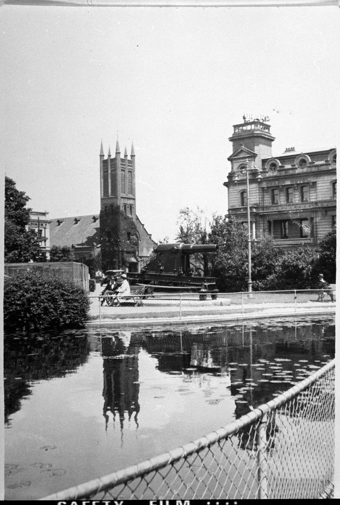 Looking across the lakelet to All Saints Church, which was built in 1914-1915. The pond was constructed in October 1909. It was the main feature of the last quadrant of The Square to be developed by the then Beautifying Society. The Lakelet is shaped as a butterfly, with the wings being bisected by a bridge as its body. It is also referred to as the Butterfly Lake. The Grand Hotel, on the left side of the photograph, was built in 1906. The cannon at centre was one of two installed in The Square in 1909. The guns were originally purchased by the Government in 1879 and installed at Fort Ngahauranga overlooking Port Nicholson, Wellington Harbour. They never fired a shot and were obsolete by 1900, when two were acquired by the Palmerston North Borough Council for display in the Square. By 1939, the Council decided the cannons had outlived their usefulness and sold them to a scrap dealer.