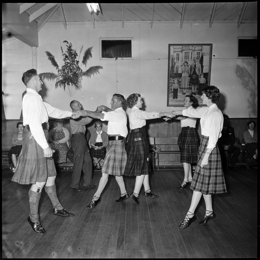 This image was taken for a story that ran in the Manawatu Evening Standard on 31 May, 1963. "Members of the Manawatu Scottish Society are seen dancing a Double Triangle representing St. Andrew's Cross, at their weekly club night."
