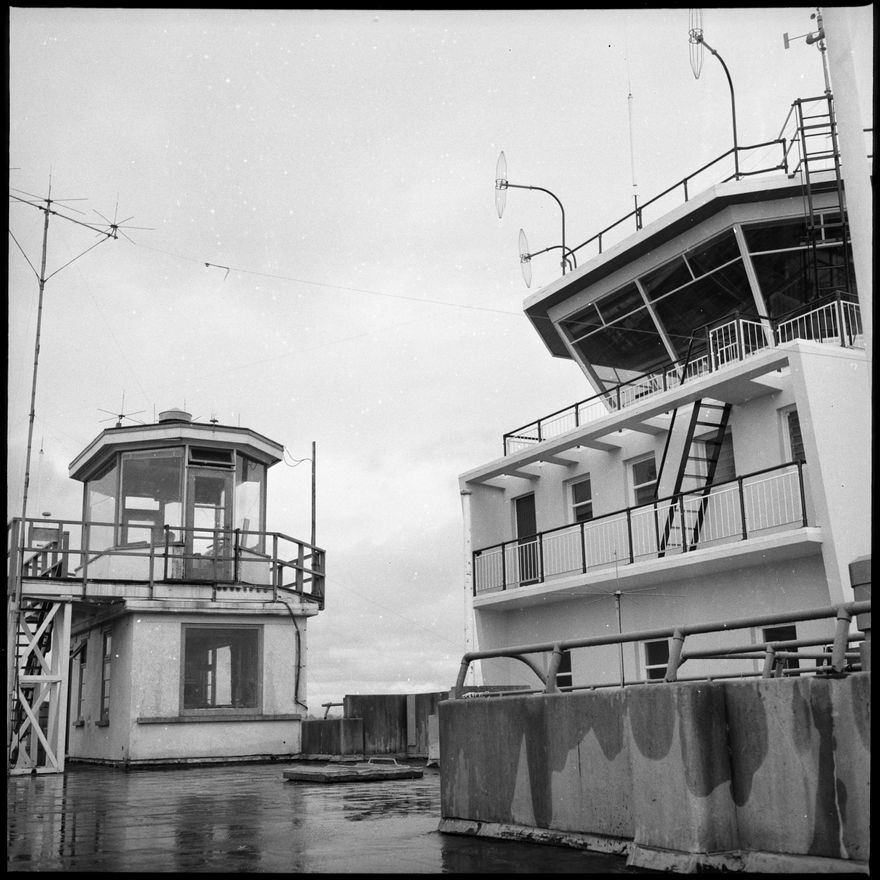 This image was taken for a story that ran in The Manawatu Evening Standard on 12th January, 1963. "The new control tower at the R.N.Z.A.F. station at Ohakea looms over the old tower. The photograph taken from the roof of the old building shows the modern design of the new tower. It is expected it will become operational in the near future."