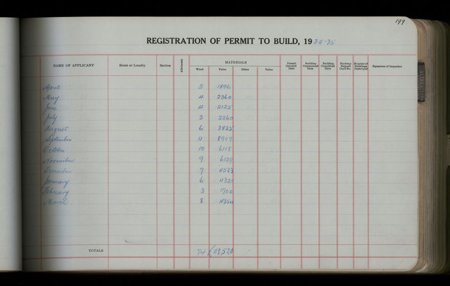Page from the third Register of Building Permits for Palmerston North Borough Council from April 1922 to March 1935.