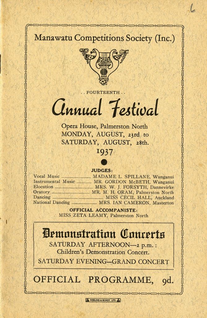 This is the programme for the Fourteenth Annual Festival of the Manawatū Competitions Society, which was held in the Opera House between 23 and 28 August 1937. The competition categories included elocution (speech and drama), dance and music (both vocal and instrumental). Most entrants were children or young people. In contrast to other years, the competitors' names are listed in an index at the back of the programme.